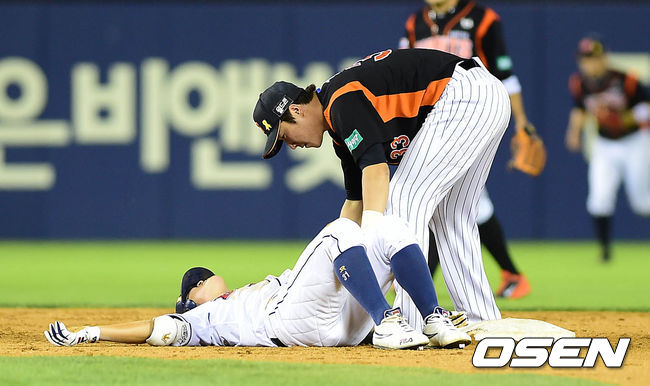 6회말 2사에서 두산 정수빈이 좌중간 안타를 치고 2루로 쇄도했으나 롯데 정훈에 의해 태그아웃되고 있다.