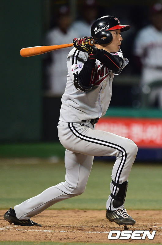 7회초 1사 1,2루 LG 김용의가 1타점 적시타를 때리고 있다.