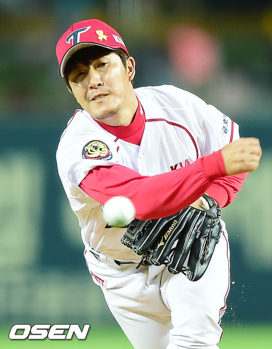 30일 오후 광주-KIA 챔피언스필드에서 열린 2014 한국야쿠르트 세븐 프로야구 KIA 타이거즈와 NC 다이노스의 경기, 7회초 무사 주자 1,2루 NC 모창민 타석에서 마운드에 오른 KIA 김병현이 힘차게 공을 뿌리고 있다.