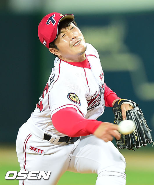 30일 오후 광주-KIA 챔피언스필드에서 열린 2014 한국야쿠르트 세븐 프로야구 KIA 타이거즈와 NC 다이노스의 경기, 7회초 무사 주자 1,2루 NC 모창민 타석에서 마운드에 오른 KIA 김병현이 힘차게 공을 뿌리고 있다.