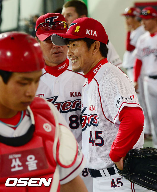 30일 오후 광주-KIA 챔피언스필드에서 열린 2014 한국야쿠르트 세븐 프로야구 KIA 타이거즈와 NC 다이노스의 경기, 7회초 무사 주자 1,2루 NC 모창민 타석에서 마운드에 오른 KIA 김병현이 7회를 마친 후 김정수 코치의 격려를 받고 있다.