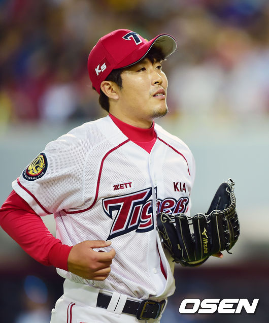 30일 오후 광주-KIA 챔피언스필드에서 열린 2014 한국야쿠르트 세븐 프로야구 KIA 타이거즈와 NC 다이노스의 경기, 7회초 무사 주자 1,2루 NC 모창민 타석에서 마운드에 오른 KIA 김병현이 7회를 마친 후 덕아웃으로 향하고 있다.