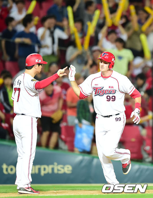 30일 오후 광주-KIA 챔피언스필드에서 열린 2014 한국야쿠르트 세븐 프로야구 KIA 타이거즈와 NC 다이노스의 경기, 8회말 2사 주자 없는 상황에서 브렛 필이 좌월 솔로 홈런을 날린 후 3루에서 김종국 코치와 하이파이브를 하고 있다.