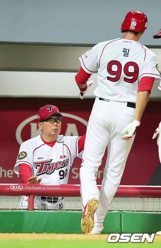 30일 오후 광주-KIA 챔피언스필드에서 열린 2014 한국야쿠르트 세븐 프로야구 KIA 타이거즈와 NC 다이노스의 경기, 8회말 2사 주자 없는 상황에서 브렛 필이 좌월 솔로 홈런을 날린 후 덕아웃에서 선동렬 감독과 하이파이브를 하고 있다.