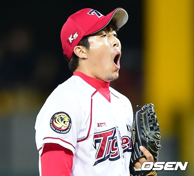 30일 오후 광주-KIA 챔피언스필드에서 열린 2014 한국야쿠르트 세븐 프로야구 KIA 타이거즈와 NC 다이노스의 경기,7회초 1사 2,3루서 NC 권희동을 삼진 처리한 KIA 김병현이 입을 벌리고 있다.