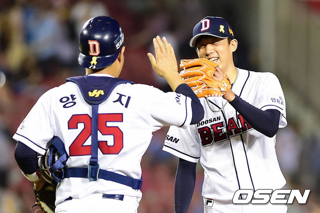 경기 종료 후 두산 오현택과 양의지가 승리의 기쁨을 나누고 있다./sunday@osen.co.kr
