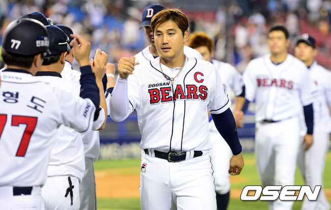 경기 종료 후 두산 홍성흔이 동료들과 승리의 기쁨을 나누고 있다./sunday@osen.co.kr