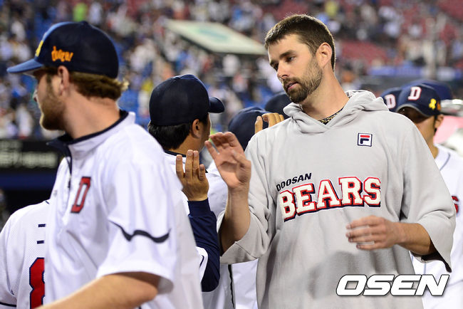 경기 종료 후 두산 니퍼트가 동료들과 승리의 기쁨을 나누고 있다./sunday@osen.co.kr