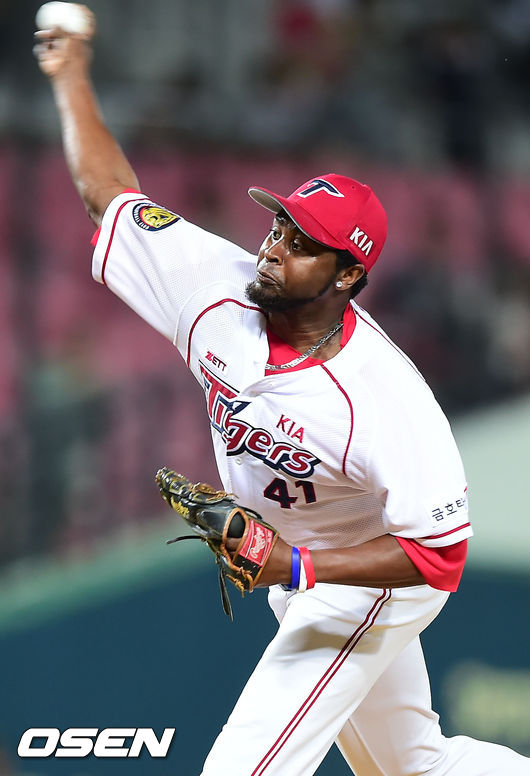 30일 오후 광주-KIA 챔피언스필드에서 열린 2014 한국야쿠르트 세븐 프로야구 KIA 타이거즈와 NC 다이노스의 경기, 9회초 2사 주자 1,3루 마운드에 오른 KIA 어센시오가 힘차게 공을 뿌리고 있다.