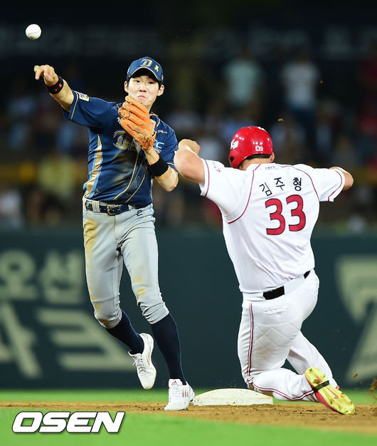 30일 오후 광주-KIA 챔피언스필드에서 열린 2014 한국야쿠르트 세븐 프로야구 KIA 타이거즈와 NC 다이노스의 경기, 9회말 무사 주자 1루 KIA 김다원의 3루수 병살타때 NC 박민우가 2루에서 김주형을 포스아웃 시킨 후 1루로 송구하고 있다.