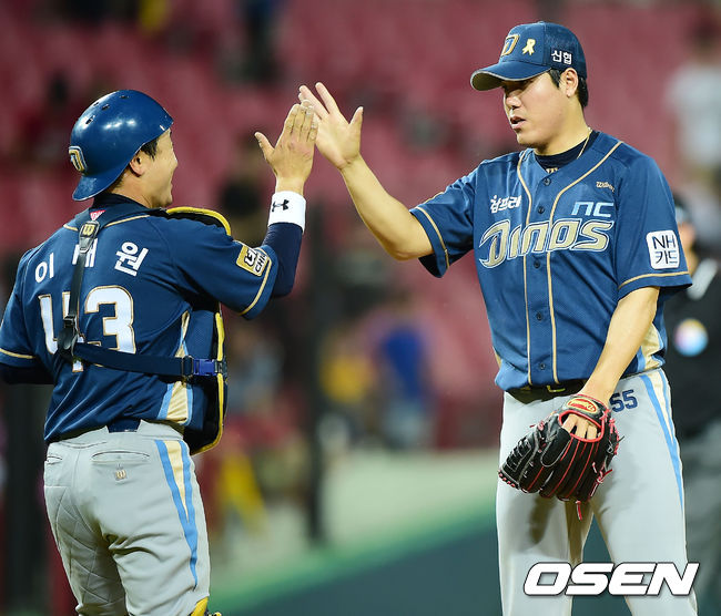 경기를 마치고 NC 김진성이 이태원과 하이파이브를 하고 있다. / rumi@osen.co.kr