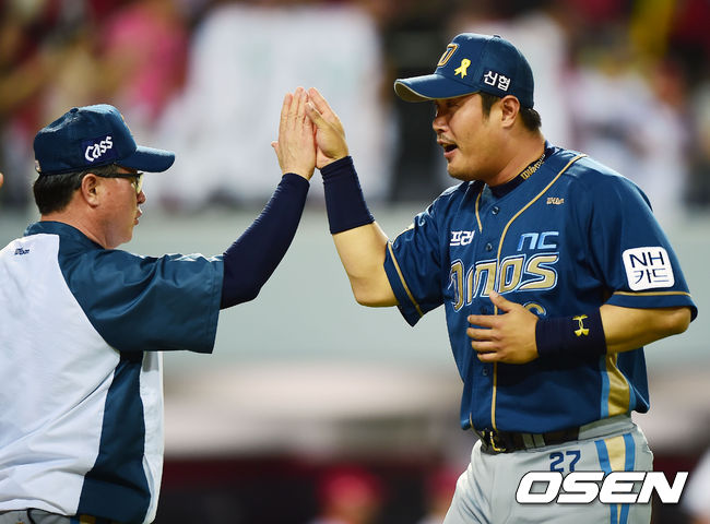 경기를 마치고 NC 이호준이 김경문 감독과 하이파이브를 하고 있다. / rumi@osen.co.kr