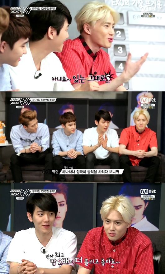 이에 전현무는 “그럼 수호가 언제 가장 한심해 보이냐”고 이간질을 햇는데, 백현은 “땀을 두 배로 흘리고 더 좋다. 멋있다”며 대답해 훈훈한 분위기를 자아냈다.
