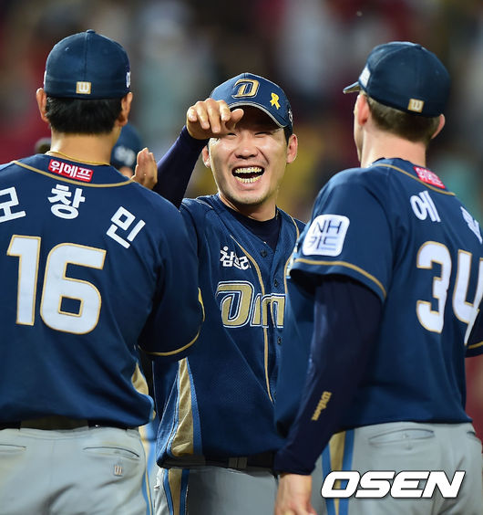 경기를 마치고 NC 지석훈이 환하게 웃으며 동료들과 하이파이브를 하고 있다. / rumi@osen.co.kr