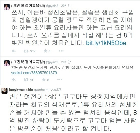 변희재 대표는 29일 자신의 트위터에 "박원순 부인의 도시락- 뭔가 이상함, 집에서 누가 스시를 만들어 먹나요. 스시, 이른바 생선초밥은, 질좋은 생선회 구입과 밥알갱이가 뭉칠 정도로 적당히 밥을 지어야 하는 초일류 요리사들만 하는 고급 요리입니다. 스시 요리를 집에서 직접 해먹는 건 8억 빚진 박원순이 처음입니다"라며 박원순 후보의 도시락을 지적하고 나섰다.