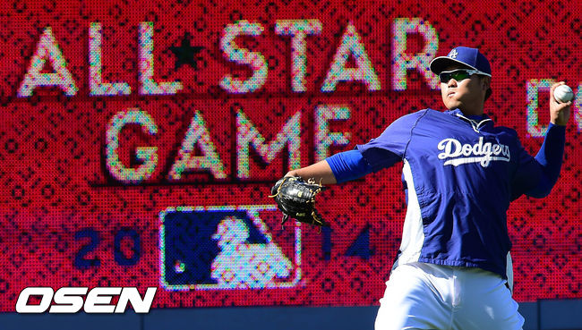 31일(이하 한국시간) 미국 캘리포니아주 로스앤젤레스 다저스타디움에서 열리는 '2014 메이저리그' LA 다저스와 피츠버그 파이어리츠의 경기 시작전 류현진이 외야에서 훈련을 하고 있다.