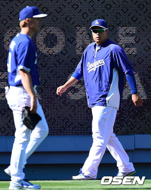 31일(이하 한국시간) 미국 캘리포니아주 로스앤젤레스 다저스타디움에서 열리는 '2014 메이저리그' LA 다저스와 피츠버그 파이어리츠의 경기 시작전 류현진이 외야에서 몸을 풀고 있다.