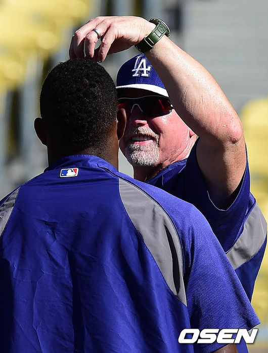 31일(이하 한국시간) 미국 캘리포니아주 로스앤젤레스 다저스타디움에서 열리는 '2014 메이저리그' LA 다저스와 피츠버그 파이어리츠의 경기 시작전 맥과이어 코치가 푸이그와 이야기를 나누고 있다.