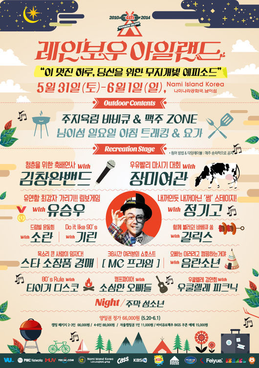 뿐만 아니라, '레인보우 아일랜드 2014 뮤직& 캠핑’는 무공해 자연 속에 위치한 남이섬에서의 특별한 캠핑을 제공, 청춘 남녀는 물론, 가족단위의 관람객까지 남녀노소 모두에게 봄 날 밤의 낭만적인 정취를 일깨울 예정이다.