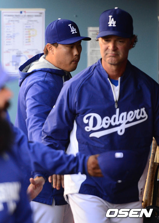 31일(이하 한국시간) 미국 캘리포니아주 로스앤젤레스 다저스타디움에서 열린 '2014 메이저리그' LA 다저스와 피츠버그 파이어리츠의 경기 시작전 류현진이 매팅리 감독과 하이파이브를 하려 하고 있다.
