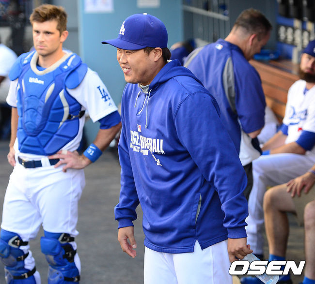 31일(이하 한국시간) 미국 캘리포니아주 로스앤젤레스 다저스타디움에서 열린 '2014 메이저리그' LA 다저스와 피츠버그 파이어리츠의 경기 시작전 류현진이 유리베와 장난을 치며 미소를 짓고 있다.