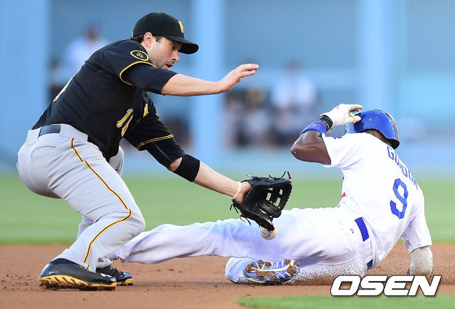 31일(이하 한국시간) 미국 캘리포니아주 로스앤젤레스 다저스타디움에서 열린 '2014 메이저리그' LA 다저스와 피츠버그 파이어리츠의 경기 1회말 무사 1루 피긴스 타석, 1루주자 고든이 도루에 성공하고 있다.