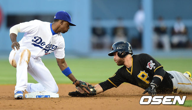 31일(이하 한국시간) 미국 캘리포니아주 로스앤젤레스 다저스타디움에서 열린 '2014 메이저리그' LA 다저스와 피츠버그 파이어리츠의 경기 2회초 2사 1루 마르테 타석, 1루주자 마틴이 도루에 실패하고 있다.