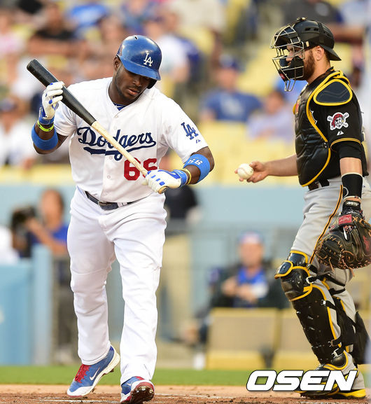 31일(이하 한국시간) 미국 캘리포니아주 로스앤젤레스 다저스타디움에서 열린 '2014 메이저리그' LA 다저스와 피츠버그 파이어리츠의 경기 1회말 1사 2루 푸이그가 삼진을 당하고 있다.
