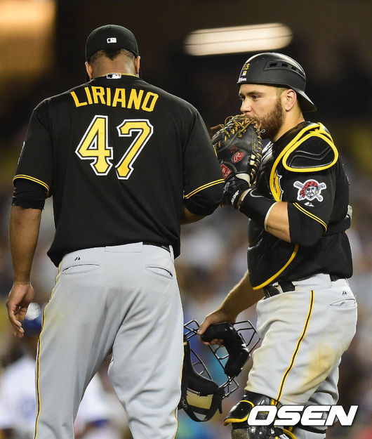 31일(이하 한국시간) 미국 캘리포니아주 로스앤젤레스 다저스타디움에서 열린 '2014 메이저리그' LA 다저스와 피츠버그 파이어리츠의 경기 5회말 2사 만루 푸이그 타석, 릴리아노와 마틴이 이야기를 나누고 있다.