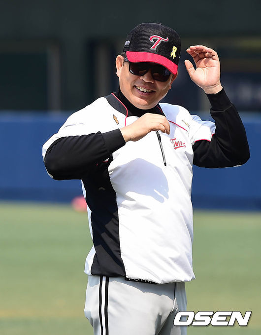 경기에 앞서 LG 양상문 감독이 선수들의 훈련을 바라보던중 미소를 짓고 있다.