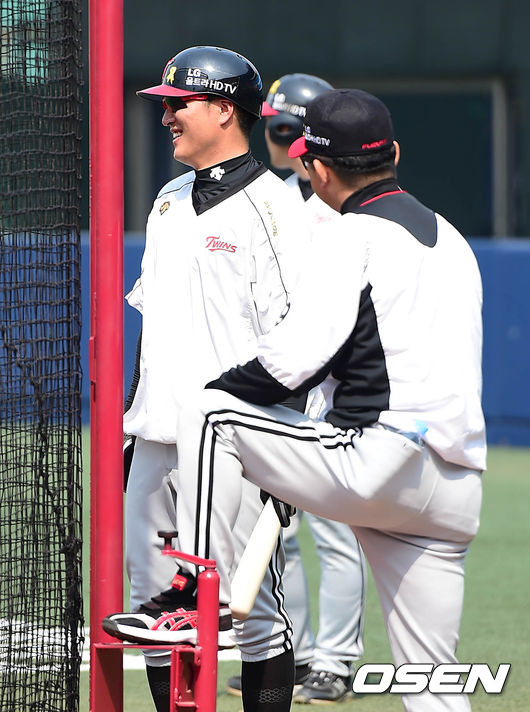 경기에 앞서 LG 양상문 감독이 이진영과 이야기를 나누고 있다.