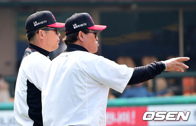 경기에 앞서 LG 양상문 감독이 김무관 타격 코치와 이야기를 나누고 있다.