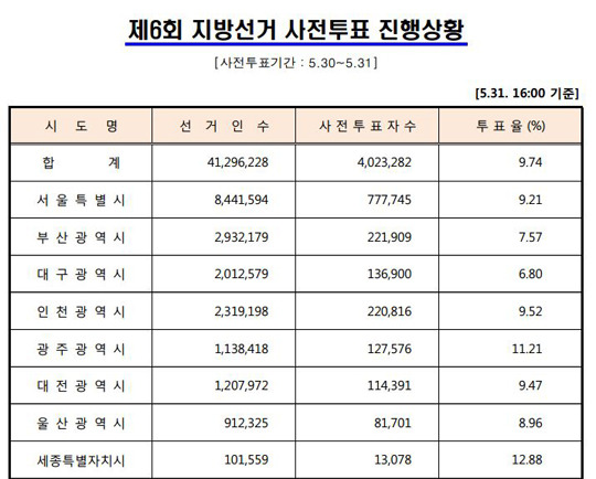 6·4 지방선거 둘째날인 31일도 새벽 6시부터 투표가 진행되고 있는 가운데, 중앙선거관리위원회의 집계에 따르면 오후 4시를 기준으로 전국 지방선거 사전투표율은 9.74%를 나타내고 있다.