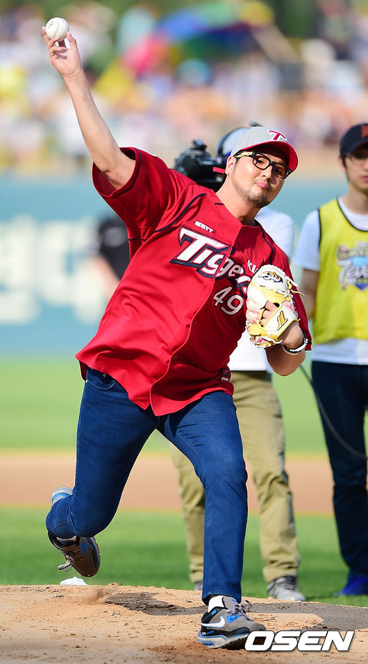 31일 오후 광주-KIA 챔피언스필드에서 열린 2014 한국야쿠르트 세븐 프로야구 KIA 타이거즈와 NC 다이노스의 경기, 그룹 god의 멤버 김태우가 시구를 하고 있다.