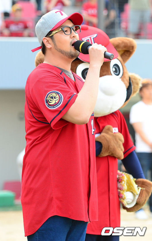 31일 오후 광주-KIA 챔피언스필드에서 열린 2014 한국야쿠르트 세븐 프로야구 KIA 타이거즈와 NC 다이노스의 경기, 그룹 god의 멤버 김태우가 시구 전 애국가 제창을 하고 있다.