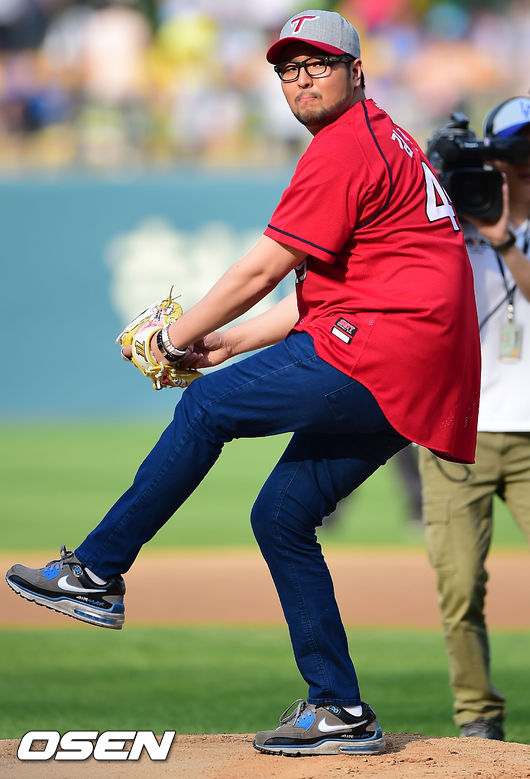 31일 오후 광주-KIA 챔피언스필드에서 열린 2014 한국야쿠르트 세븐 프로야구 KIA 타이거즈와 NC 다이노스의 경기, 그룹 god의 멤버 김태우가 시구를 하고 있다.