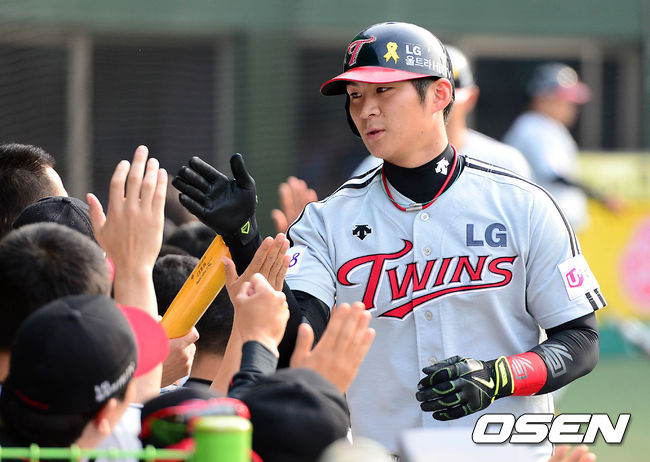 1회초 무사 2루에서 LG 오지환이 중월 투런 홈런을 치고 더그아웃에서 환호하고 있다.