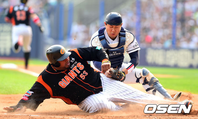 1회초, 무사 3루 황재균의 내야땅볼때 3루주자 히메네스가 홈을 파고 들었으나 양의지에게 태그아웃되고 있다.
