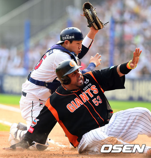 1회초, 무사 3루 황재균의 내야땅볼때 3루주자 히메네스가 홈을 파고 들었으나 양의지로부터 태그아웃되고 있다.