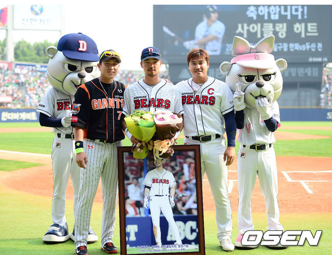 경기에 앞서 사이클링 히트를 달성한 두산 오재원과 롯데주장 박준서, 두산주장 홍성흔이 기념촬영을하고 있다.
