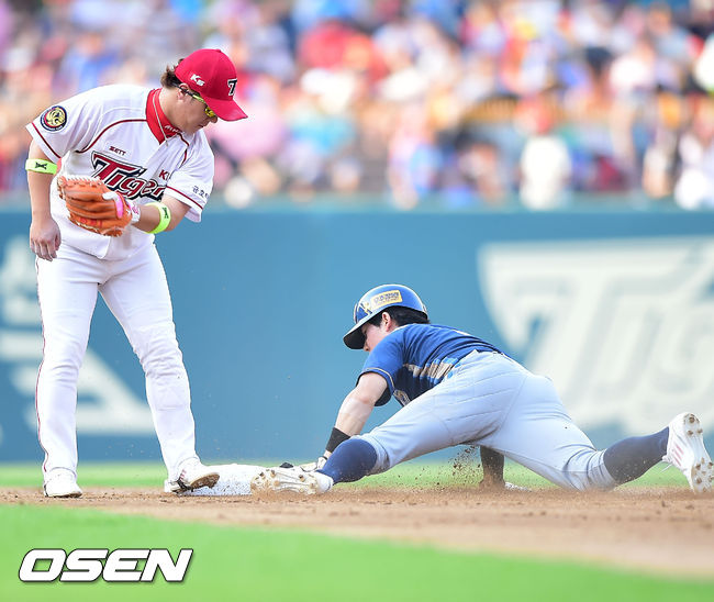 31일 오후 광주-KIA 챔피언스필드에서 열린 2014 한국야쿠르트 세븐 프로야구 KIA 타이거즈와 NC 다이노스의 경기, 3회초 2사 주자 1루 NC 이종욱 타석에서 1루 주자 박민우가 2루 도루에 성공하고 있다.