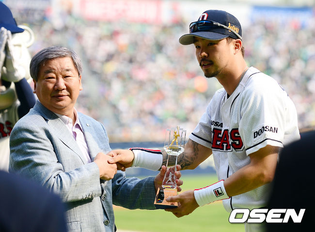 경기에 앞서, 사이클링 히트를 달성한 오재원이 기념트로피를 들고 KBO 구본능 총재와 기념촬영을 하고 있다.