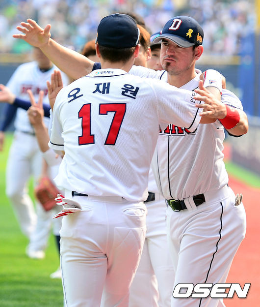 경기에 앞서, 사이클링 히트 기념 시상식을 끝낸 오재원이 칸투와 포옹을 나누고 있다.
