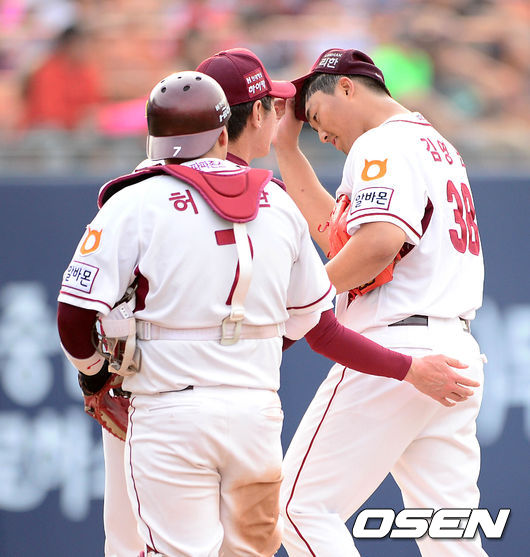4회초 1사 1,2루에서 넥센 김영민이 마운드를 내려가고 있다.