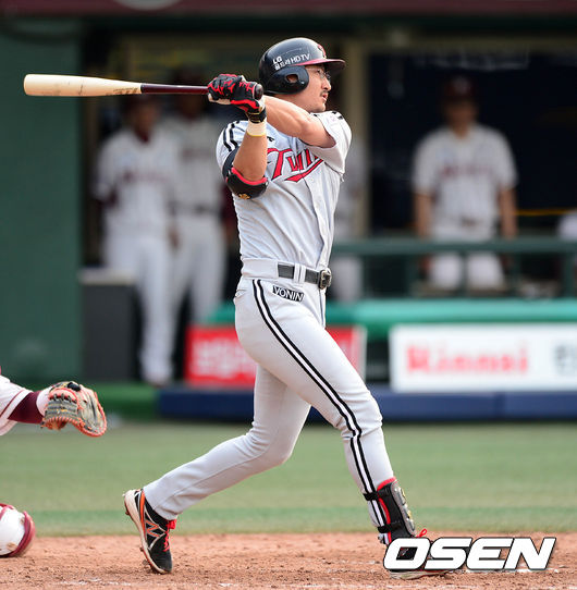 4회초 1사 1,2루에서 LG 박용택이 우중간 적시 2루타를 치고 있다.