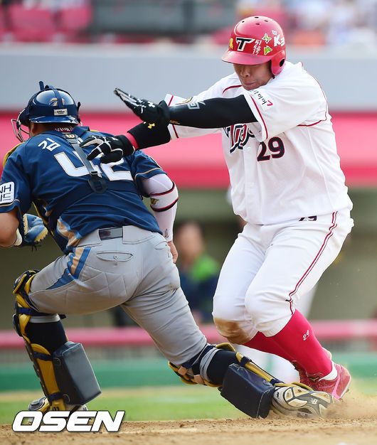 31일 오후 광주-KIA 챔피언스필드에서 열린 2014 한국야쿠르트 세븐 프로야구 KIA 타이거즈와 NC 다이노스의 경기, 4회말 1사 주자 2,3루 KIA 김다원의 유격수 앞 땅볼때 3루 주자 나지완이 홈으로 몸을 던지며 NC 김태군의 다리에 걸리고 있다. KIA 나지완은 홈플레이트를 못밟았지만 NC 김태군이 다리를 뻗은 것이 주루 방해로 인정되며 득점을 올렸다.