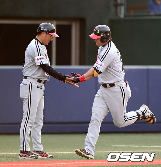 5회초 무사에서 LG 정의윤이 중월 솔로 홈런을 치고 그라운드를 돌고 있다.