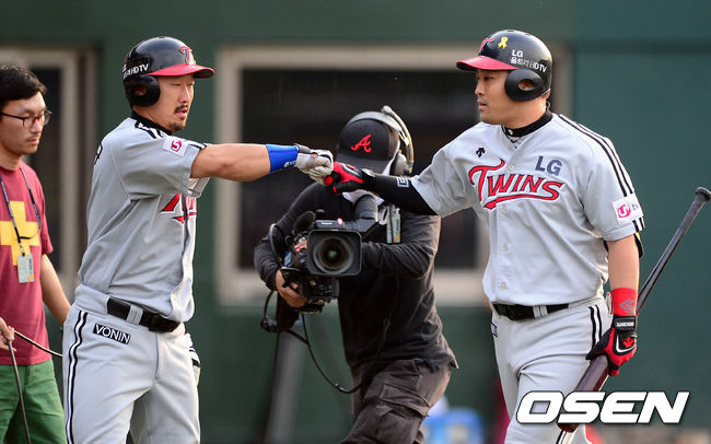 5회초 무사에서 LG 정의윤이 중월 솔로 홈런을 치고 홈에서 이병규과 하이파이브를 하고 있다.