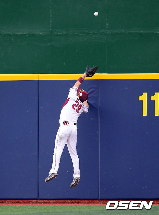 5회초 무사에서 LG 정의윤이 중월 솔로 홈런떄 넥센 이택근이 타구를 잡으려 점프를 하고 있다.