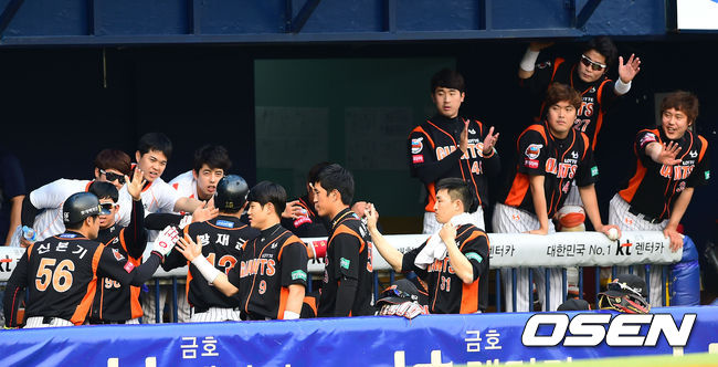 4회초 무사 2,3루 강민호의 2타점 적시타로 홈을 밟은 2루주자 신본기와 3루주자 황재균이 덕아웃에서 동료들과 하이파이브를 나누고 있다.